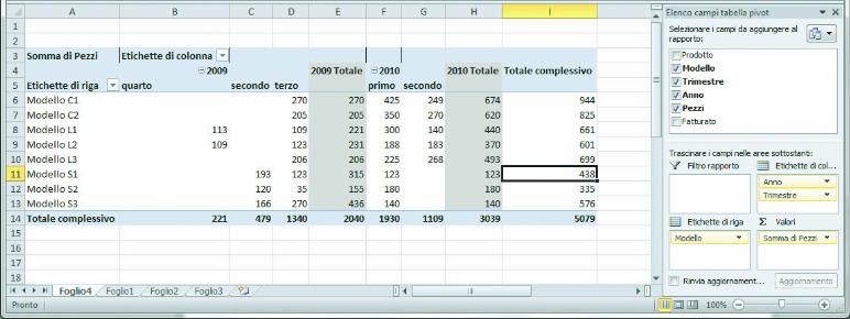 Per ogni modello ricava il numero dei pezzi ottenuti per ogni trimestre di