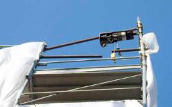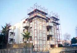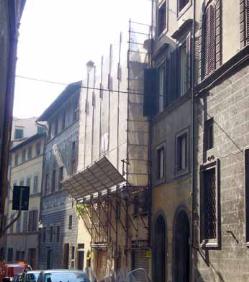 Ponteggio in centro storico protetto da un impalcato di