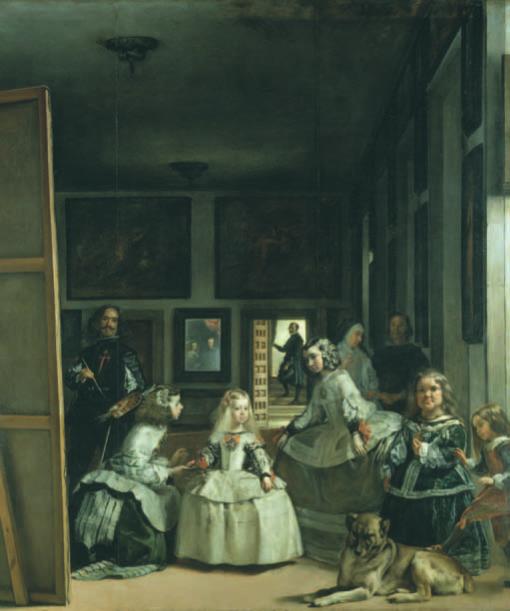 è circondata da due damigelle d’onore, due nani e un cane. In un piano luminoso me-