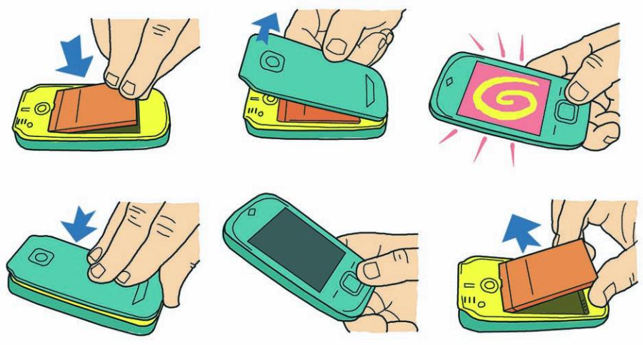 Reorder the six pictures which show how to change a smart phone’s battery.