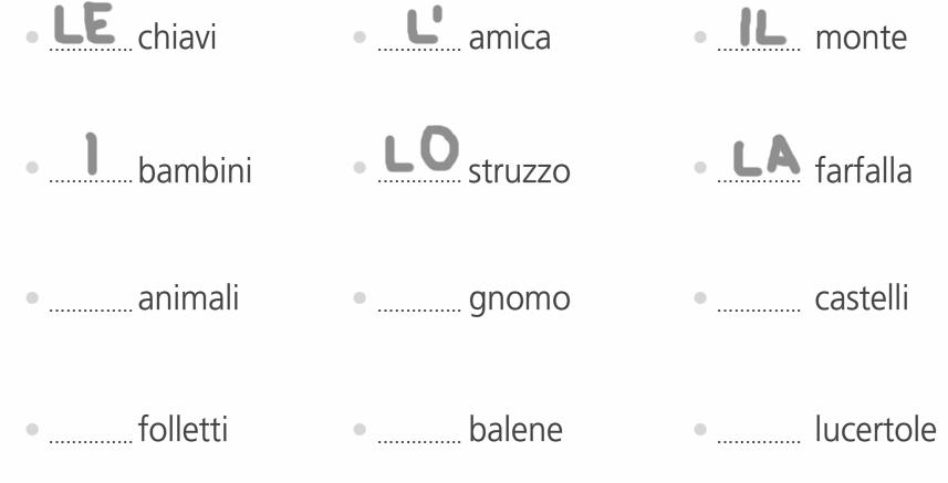 Apriamo il fle “02_articoli_de-terminativi” e chiamiamo a tur-no i bambini alla LIM invitandoli a inserire l’articolo determinativo adatto ai nomi, scegliendo tra IL, LO, LA, L’, I, GLI, LE. Facciamo utilizzare lo strumento “penna”.