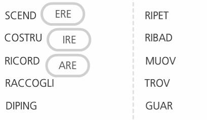 Giochiamo con i bambini a formare i verbi trovando la desinenza corretta e trascinandola accanto alla sua ra-dice. Chiediamo poi a quale coniu-gazione appartiene il verbo formato. Utilizziamo il fle “02_scopri_desi-nenza”.