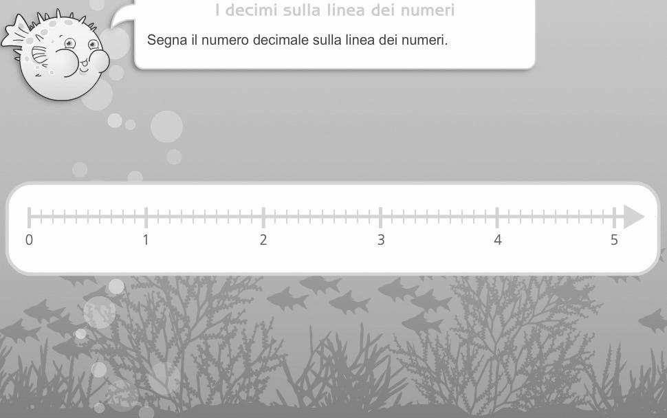 Apriamo il fle “01_decimi_linea_nume-ri”. Chiamiamo i bambini uno a uno alla LIM, scegliamo un numero decima-le compreso tra due interi e invitiamo l’alunno a usare la “penna” rossa per tracciarne la posizione sulla linea. Spieghiamo che, nella scrittura, i nu-meri interi sono separati da quelli deci-mali dalla virgola e che nella lettura la virgola si legge “e”: per esempio 0,8 si legge zero e otto decimi oppure otto decimi .