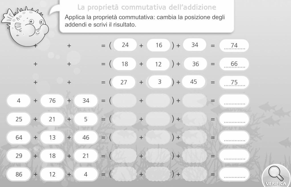 Per perfezionare lo studio della pro-prietà commutativa dell’addizione a-priamo il fle “02_proprieta_commu-tativa_addizione”, invitiamo i bambini uno a uno alla LIM e chiediamo loro di posizionare gli addendi, con la tecnica del drag and drop, in modo che il cal-colo risulti più semplice e di scrivere il risultato con lo strumento “penna” o la “tastiera virtuale“.