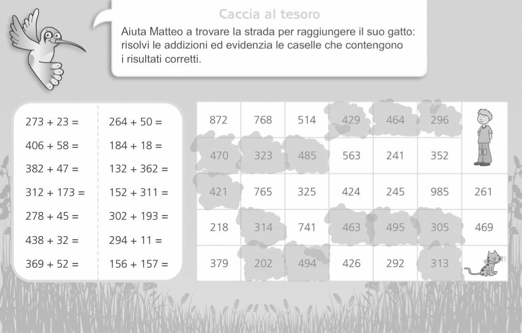 Apriamo il fle “01_ caccia_tesoro”, invi-tiamo i bambini a turno alla LIM e chie-diamo loro di eviden-ziare, con lo strumen-to “evidenziatore”, le caselle con il risultato esatto delle addizioni. In questo modo tro-veranno la strada che il bambino deve com-piere per raggiungere il suo gatto.