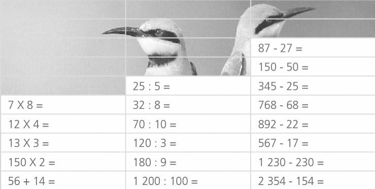 Apriamo il fle “06_puzzle”, invitiamo i bambini uno a uno alla LIM e chiediamo loro di calcolare a mente il risultato di un’operazione tra quelle nella tabella. Successivamente invitiamoli a cercare il risultato in basso e a trascinarlo sopra l’operazione corrispondente con il drag and drop. Quando tutti i calcoli sono stati eseguiti si comporrà un’immagine.