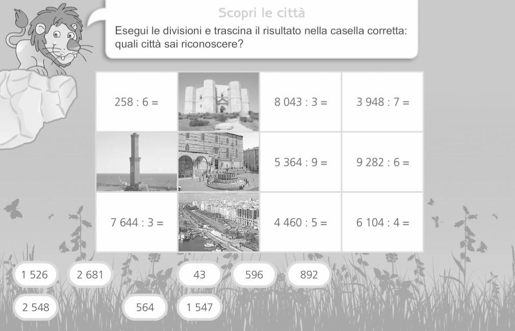 Apriamo il fle “07_scopri_citta”, chiamiamo i bambini a coppie alla LIM e invitiamoli a eseguire le divi-sioni date. Chiediamo loro di tra-scinare il cartellino con il risultato sulla casella della relativa operazio-ne. Questo permetterà di scoprire l’immagine di una città italiana. Chiediamo quindi di scrivere con la “penna“ il nome delle città.