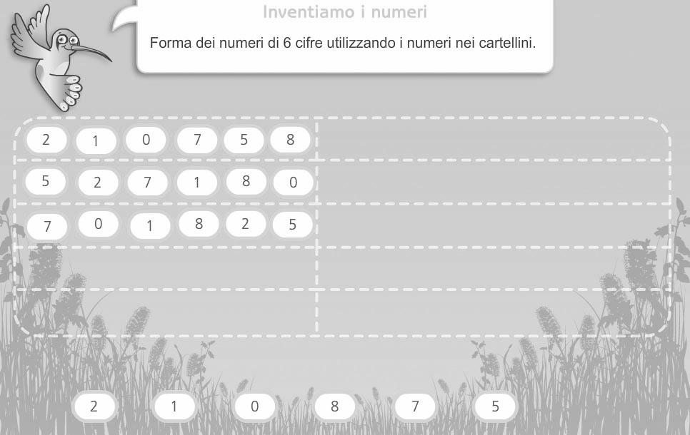Acquisire padronanza nella compo-sizione dei numeri e nel riconosci-mento del valore posizionale delle cifre costituisce il presupposto fon-damentale per raggiungere sicu-re competenze anche nel calcolo. Apriamo il fle “03_inventiamo_nu-meri”, chiamiamo singolarmente i bambini alla LIM e chiediamo di formare alcuni numeri di 6 cifre uti-lizzando le cifre date. L’esercizio ac-