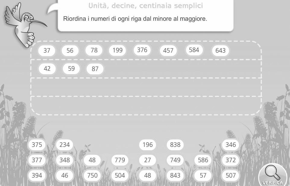 Ripassiamo e consolidiamo la cono-scenza dei numeri naturali partendo dal periodo delle unità semplici. Apriamo il fle “01_centinaia_sempli-ci” e chiediamo ai bambini di leggere i numeri dati. Invitiamoli a riordinare i numeri di ciascuna riga dal minore al maggiore, con la tecnica del drag and drop.