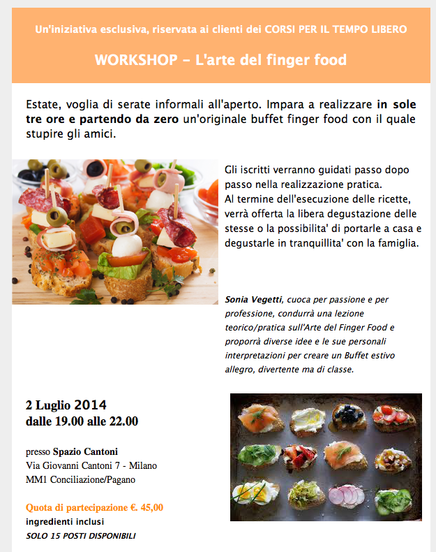 La scelta dei colori caldi e le foto di stuzzichini invitanti comunicano con immediatezza di che tipo di workshop si tratta: “l’arte del finger food”.